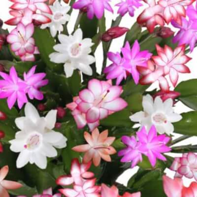 De Tricolore (3 kleuren) en Quattrolore (4 kleuren) bloeien natuurlijk even prachtig. Deze staan in een kleinere pot. De Kerstcactus op zijn best in deze periode van het jaar!